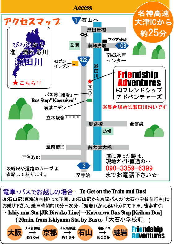 | 【重要】集合場所の弊社前駐車スペースには 限りがございます。 できるだけ乗り合いにてお越し下さいませ。 複数台でお越しの場合、駐車できない事がございます。 (駐車のご予約は出来ません。) ●満車の場合は・・・下記MAPの「広場」へ駐車頂き、バスにてお越し下さいませ。 「広場」からは、広場出口のバス停 「宮前橋」 から「石山駅行き」にお乗り下さい。 約3分の 「蛙岩」 で下車すぐです。(「宮前橋」から2つめのバス停) 京阪バスの 「宮前橋」 から「蛙岩 」 までの時刻表はコチラ また隣接施設には絶対に駐車しないよう、ご協力お願い致します<m(__)m> ![]() ※GW中やお盆休み中は各高速道路、一般道路にて 交通渋滞が予想されますので、お早めにご出発下さい。 集合時間から15分以上遅刻の場合は、ツアースケジュールに支障が出、 先に来られている他のお客様へのご迷惑が掛かりますので、 申し訳有りませんが、当日キャンセルとさせて頂きます。 |